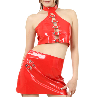 首輪をイメージしたホルターネックのビスチェと、ヒップの編み上げが特徴のスカートのツーピースセット。光沢のある赤色がエロティックで情熱的な印象で、いつもよりも大胆になれそうな可愛らしさの中にエロさを秘めたコスチュームです。