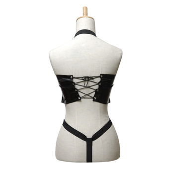 お腹を思いっきり露出しちゃう短めの丈とフロントのベルトがポイントのビスチェ、お尻がプリッと丸見えになるエッチなTバックショーツの組み合わせのボンデージコスチューム。